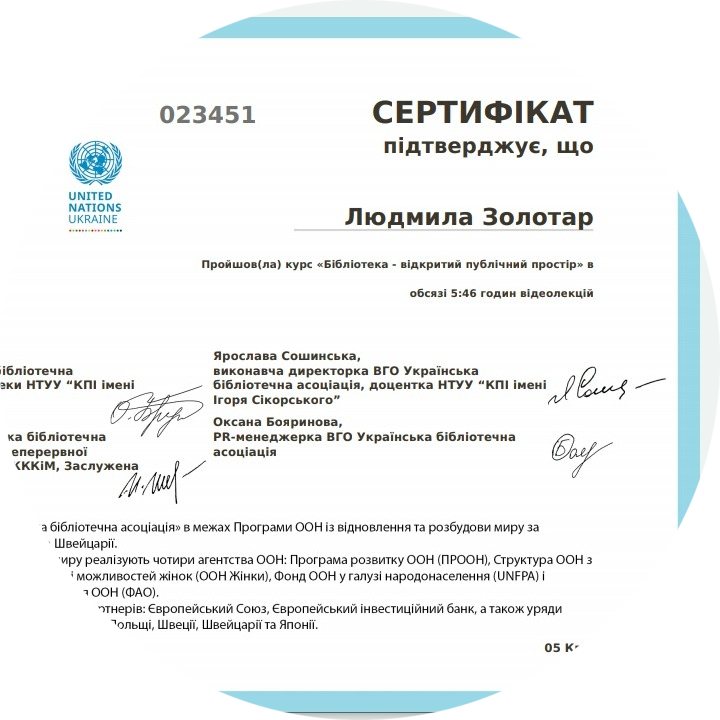 Провідна бібліотекарка Людмила Золотар пройшла освітній онлайн-курс «Бібліотека – відкритий публічний простір» та отримала сертифікат. Цей курс розроблений ВГО «Українська бібліотечна асоціація» для бібліотекарів, він дає можливість розширити компетентності і в майбутньому стати «агентами змін» у своїй бібліотеці. Шановні колежанки долучайтесь!
