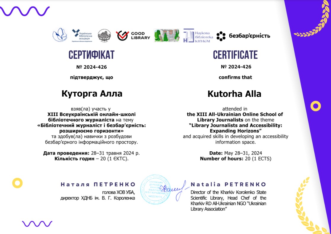 Бібліотекарі БДПУ взяли участь у ХІІІ Всеукраїнській онлайн-школі бібліотечного журналіста на тему «Бібліотечний журналіст і безбар’єрність: розширюємо горизонти», яка відбулась з 28–31 травня 2024 р.