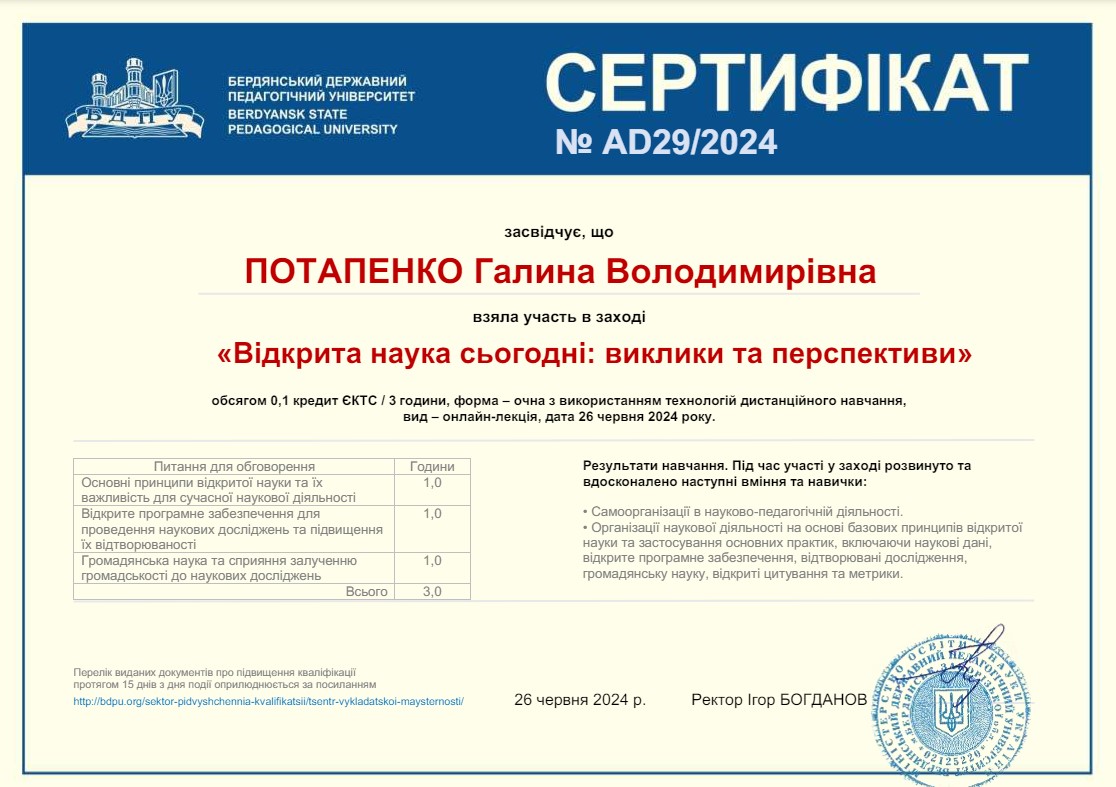 26 червня 2024 року о 16:00 у рамках програми підвищення кваліфікації науково-педагогічних працівників Бердянського державного педагогічного університету “ARS DOСENDI” і в межах реалізації проєкту Open4UA відбулась онлайн-лекція “Відкрита наука сьогодні: виклики та перспективи”.