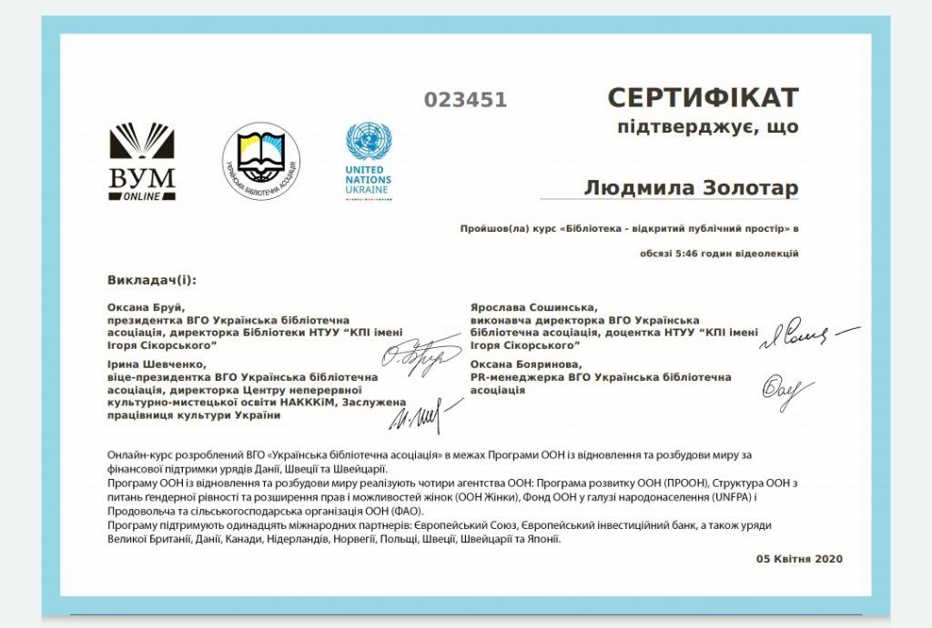 У сучасному інформаційному суспільстві роль бібліотекарів значно зросла, перетворюючи їх на важливих провідників у світі знань та інформації. Бібліотекарі активно беруть участь у різних заходах, включаючи вебінари та тренінги, де вони здобувають нові знання та отримують сертифікати. Професійний розвиток у бібліотечній сфері стає ключовим елементом кар’єрного зростання, адже бібліотечна освіта забезпечує необхідні навички та компетенції для ефективного виконання своїх обов’язків. Участь у таких заходах допомагає бібліотекарям залишатися в курсі сучасних тенденцій, впроваджувати інноваційні підходи та підвищувати рівень інформаційної грамотності користувачів.