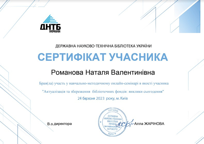 У сучасному інформаційному суспільстві роль бібліотекарів значно зросла, перетворюючи їх на важливих провідників у світі знань та інформації. Бібліотекарі активно беруть участь у різних заходах, включаючи вебінари та тренінги, де вони здобувають нові знання та отримують сертифікати. Професійний розвиток у бібліотечній сфері стає ключовим елементом кар’єрного зростання, адже бібліотечна освіта забезпечує необхідні навички та компетенції для ефективного виконання своїх обов’язків. Участь у таких заходах допомагає бібліотекарям залишатися в курсі сучасних тенденцій, впроваджувати інноваційні підходи та підвищувати рівень інформаційної грамотності користувачів.