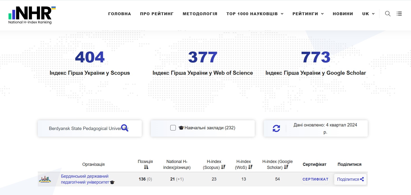 Рейтинг враховує сумарний показник індексу Гірша наукових установ України з урахуванням відомостей наукометричних баз даних та платформ Scopus, Web of Science та Google Scholar. На основі цих даних формується індикатор National H-index Ranking та відповідна ранжована позиція в рейтингу (Position).