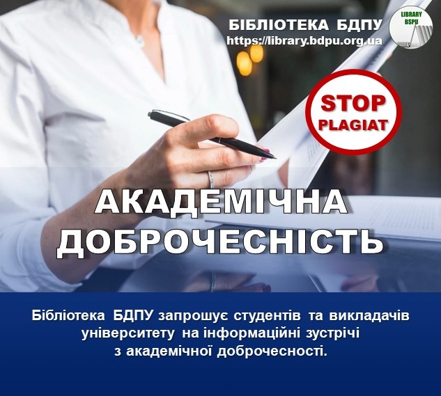 Бібліотека БДПУ запрошує викладачів та студентів університету приєднуватись до інформаційних зустрічей з академічної доброчесності. Онлайн-зустрічі відбуваються окремо для кожного факультету та спеціальності. Заходи проводяться за попереднім узгодженням, надішліть запит на корпоративну пошту бібліотеки: library@bdpu.org.ua для обговорення деталей.