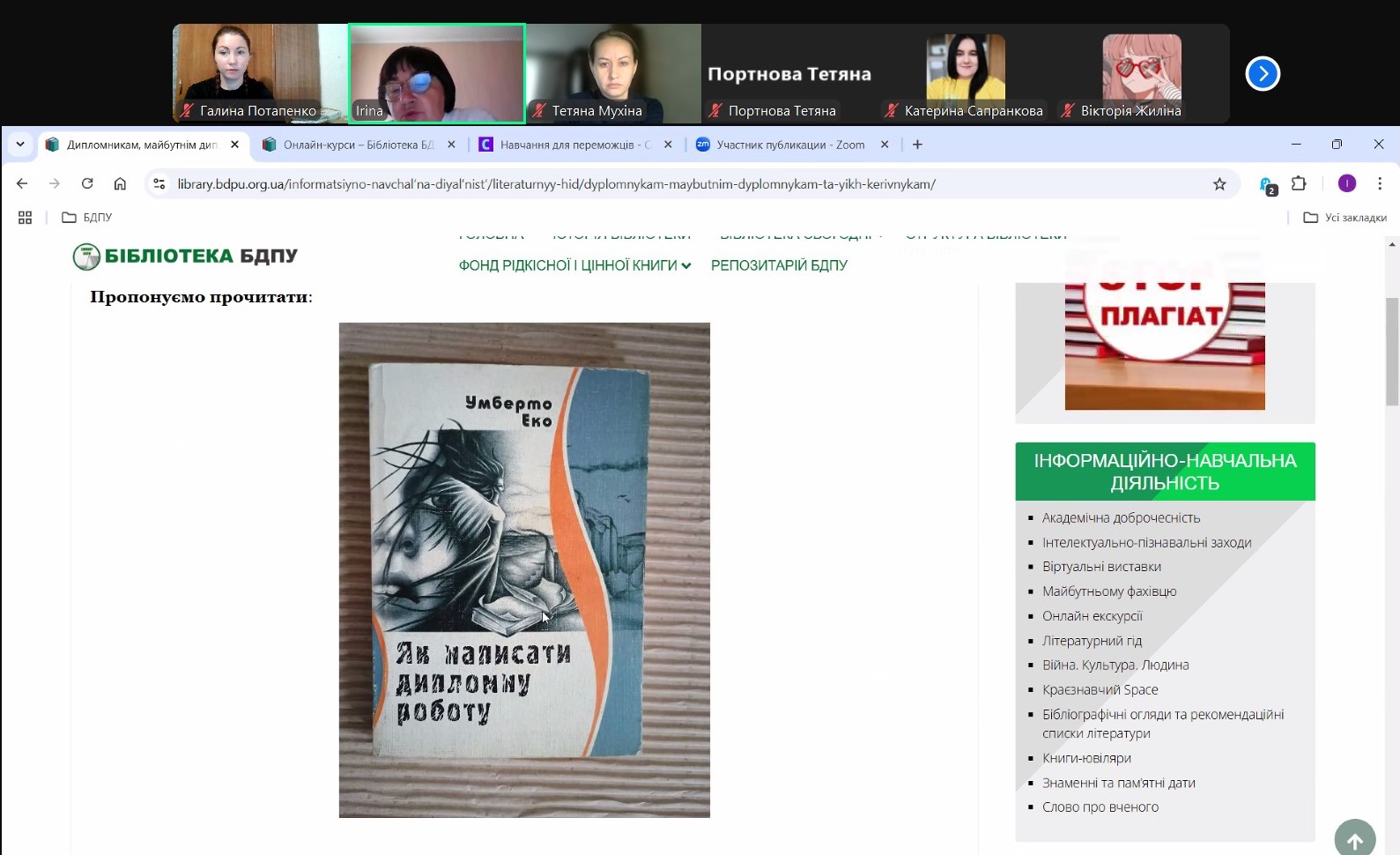 Завершенням зустрічі стало ознайомлення з онлайн-ресурсами бібліотеки БДПУ, які доступні студентам для досліджень, підготовки робіт та розвитку критичного мислення. Це включало міжнародні бази даних, відкриті ресурси, а також віртуальні виставки, що допомагають у пошуку літератури до конкретних тем.