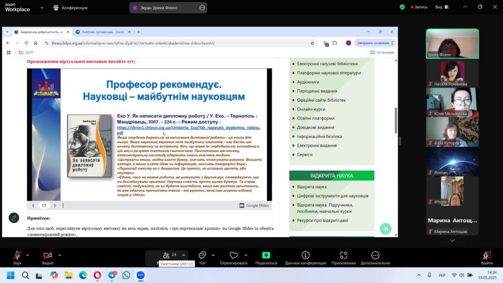 В рамках Днів науки в БДПУ бібліотека презентувала виставку «Академічна доброчесність, академічне письмо в контексті наукових досліджень». Зав. відділом обслуговування бібліотеки Ірина Філон розповіла про структуру виставки, познайомила з різноманітними виданнями (монографії, навчальні посібники, путівники, інтегровані навчальні курси).
