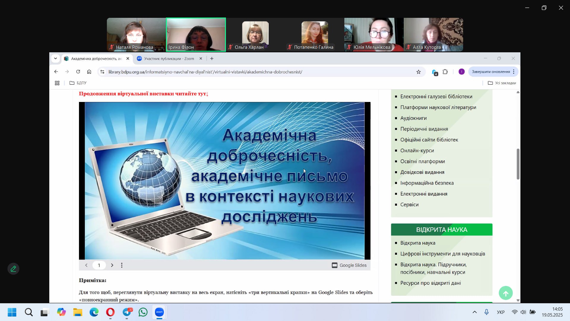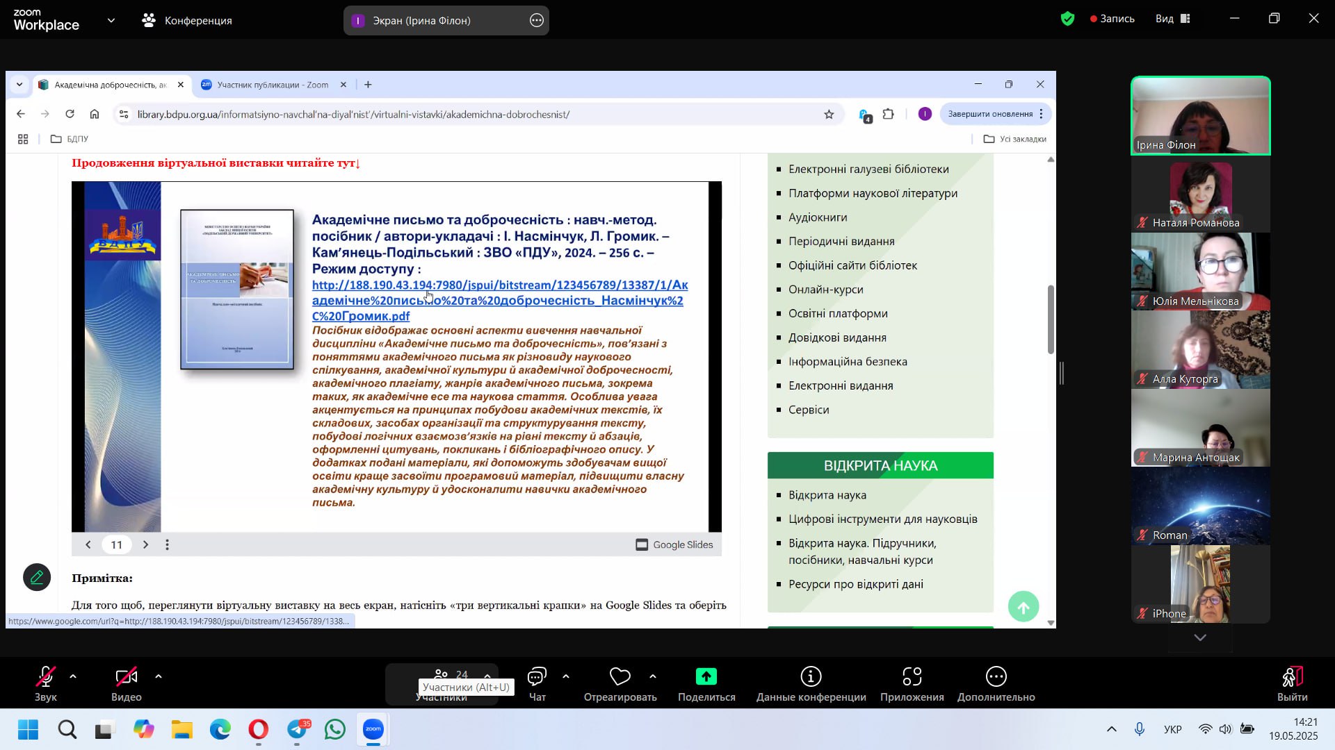 В рамках Днів науки в БДПУ бібліотека презентувала виставку «Академічна доброчесність, академічне письмо в контексті наукових досліджень». Зав. відділом обслуговування бібліотеки Ірина Філон розповіла про структуру виставки, познайомила з різноманітними виданнями (монографії, навчальні посібники, путівники, інтегровані навчальні курси).