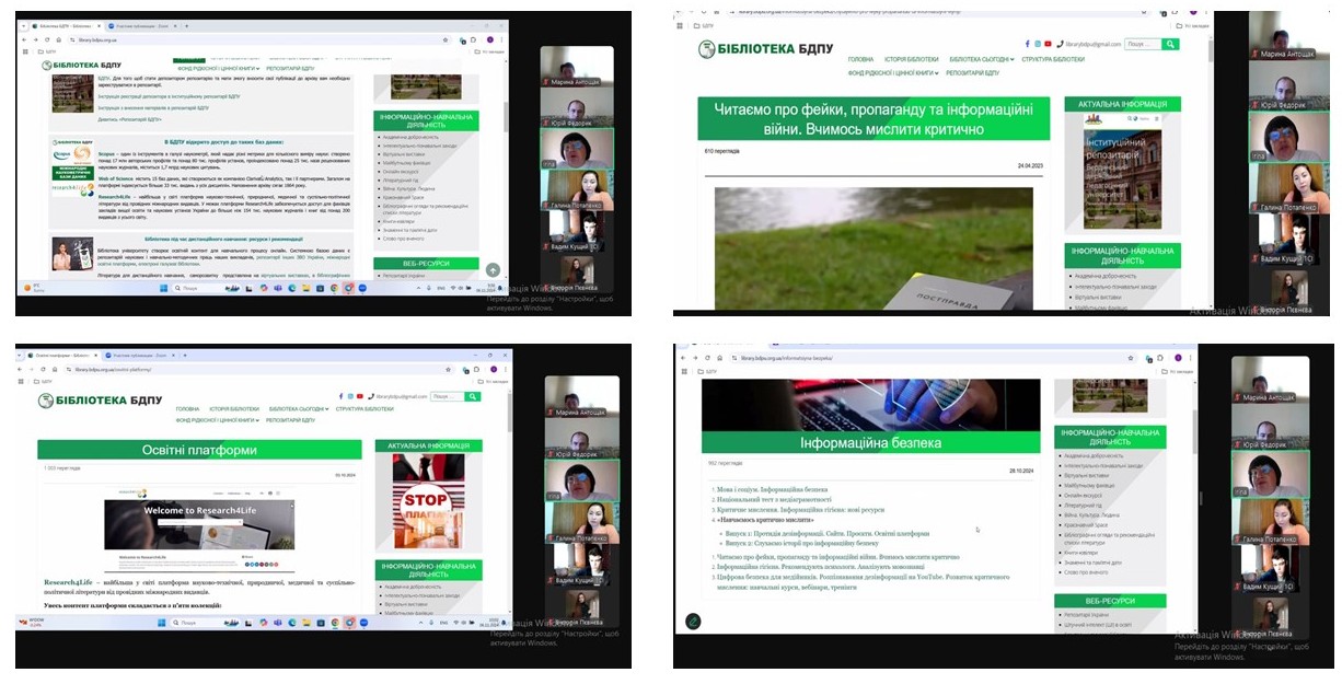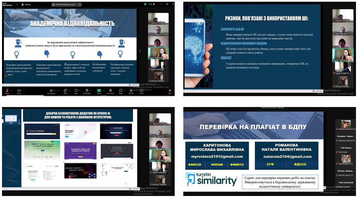 Окрема увага приділялась впливу штучного інтелекту на освіту. Пані Галина пояснила, як правильно використовувати технології для пошуку наукової інформації, і навела приклади безкоштовних програм, які допомагають студентам знаходити наукову літературу, а також антиплагіатних сервісів, що забезпечують перевірку робіт на відповідність вимогам доброчесності. Зокрема, було відзначено, що в БДПУ використовують систему Turnitin, а перевірку робіт здійснюють уповноважені фахівці бібліотеки, які розподілені за факультетами.