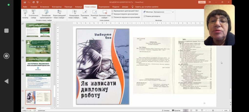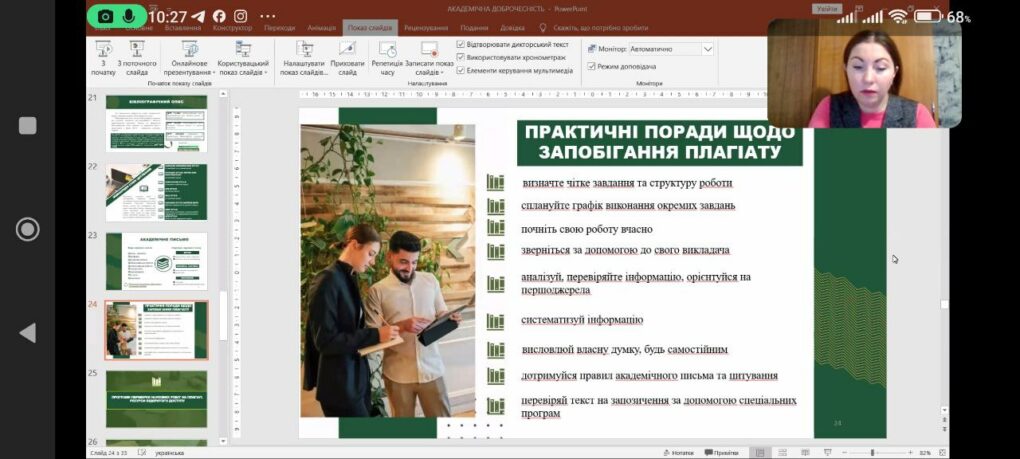 Провідна бібліотекарка Галина ПОТАПЕНКО розповіла про академічну доброчесність в університетській спільноті. Здобувачі вищої освіти мали змогу дізнатись про основні принципи академічної доброчесності, поняття плагіату та обговорити питання використання штучного інтелекту ChatGPT учасниками наукової спільноти у контексті дотримання умов академічної доброчесності.