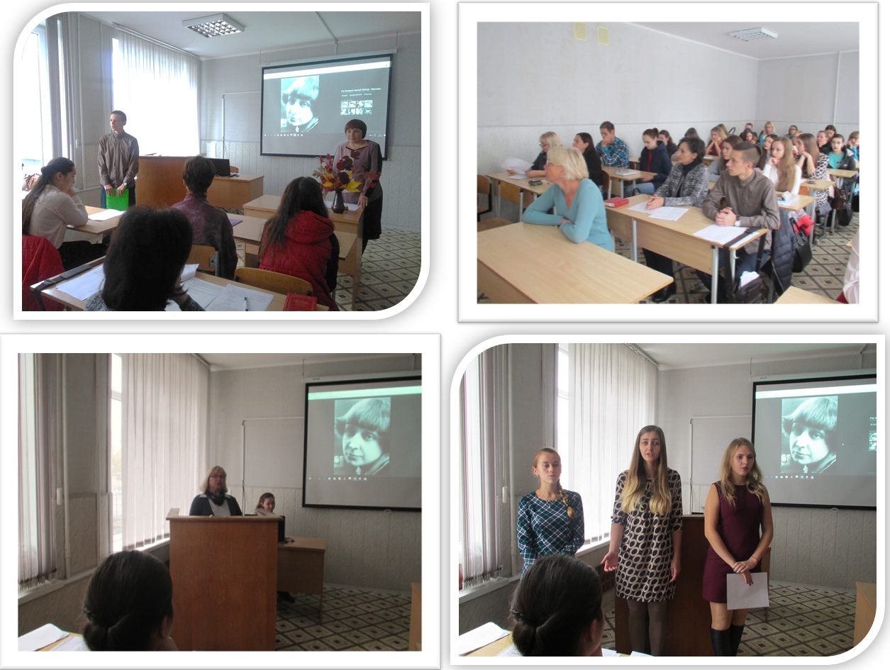 Про життєвий і творчий шлях поета розповіла аудиторії к.філ.н., доц. І.Е. Співак. Ії розповідь доповнили фрагменти художнього фільму про Цвєтаєву та романс у виконанні Олени Камбурової.