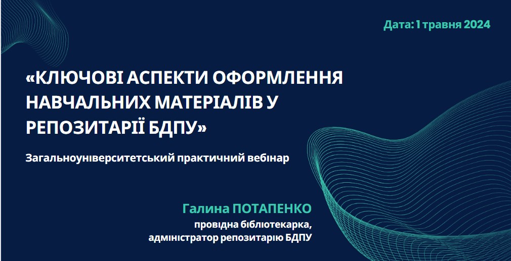 1 травня відбувся загальноуніверситетський практичний вебінар «Ключові аспекти оформлення навчальних матеріалів у репозитарії БДПУ», спікером якого була Галина ПОТАПЕНКО, провідна бібліотекарка, адміністраторка репозитарію.
