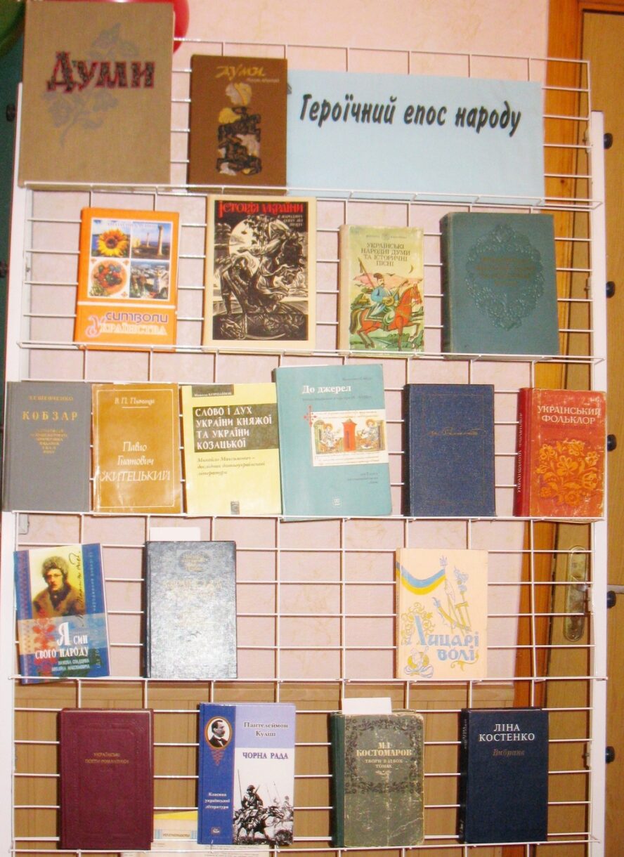 В часи суспільно – політичних випробувань  в культурі гостро стоїть вічне питання співвідношення традицій та новаторства, болісно відчуваються розірвані зв’язки, чорніють провали втрат. Феномен кобзарства, як носій історичної пам’яті народу, вивчався дослідниками продовж століть. Традиції творців і виконавців народного епосу трагічно перервані у 30 – х роках ХХ ст. відроджуються на сучасному рівні в нових творчих формах. Про все це йшла мова під час кінолекторію «Кобзарство як феномен української культури». Фахівець бібліотеки Філон І.М. розповідала про нові розвідки з історії кобзарства. Виставку «Героїчний епос народу» підготували Куторга А.В. та Парапанова О.Є.