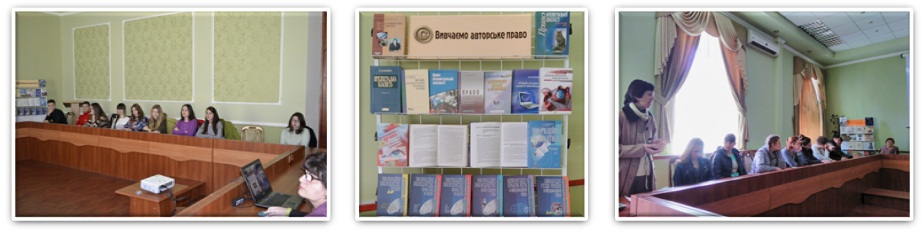Професійно підготовлена бібліотекарями виставка «Вивчаємо авторське право», проілюструвала виступ к. юр. н., доц. кафедри правознавства Катерини Дудорової.