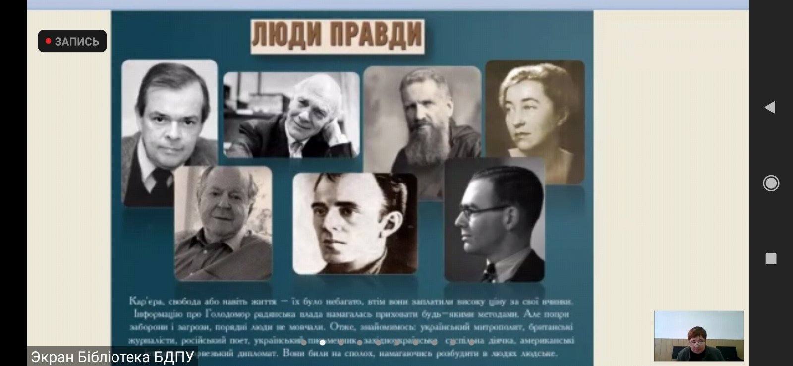 Бібліотечна літературна вітальня запрацювала у форматі онлайн-конференції. 03.12. 20 відбувся захід «Люди правди», присв’ячений Дню пам’яті жертв Голодомору. Розмова йшла про тих, хто героїчно опирався злу, рятував людей, намагався розкрити страшну правду, донести її до світу. Центральним сюжетом стала захоплююча історія Гарета Джонса, героїчного журналіста, життя якого послуговала основою для фільму Агнешки Холанд «Ціна правди» ( 2019р).