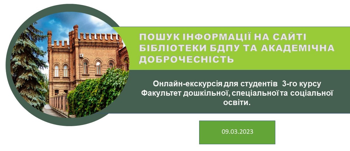 В березні 2023 року була проведена інформативна та змістовна онлайн-екскурсія для 3-го курсу Факультет дошкільної, спеціальної та соціальної освіти. На якій було розглянуто такі питання: академічна доброчесність, плагіат і пошук інформації на сайті бібліотеки.