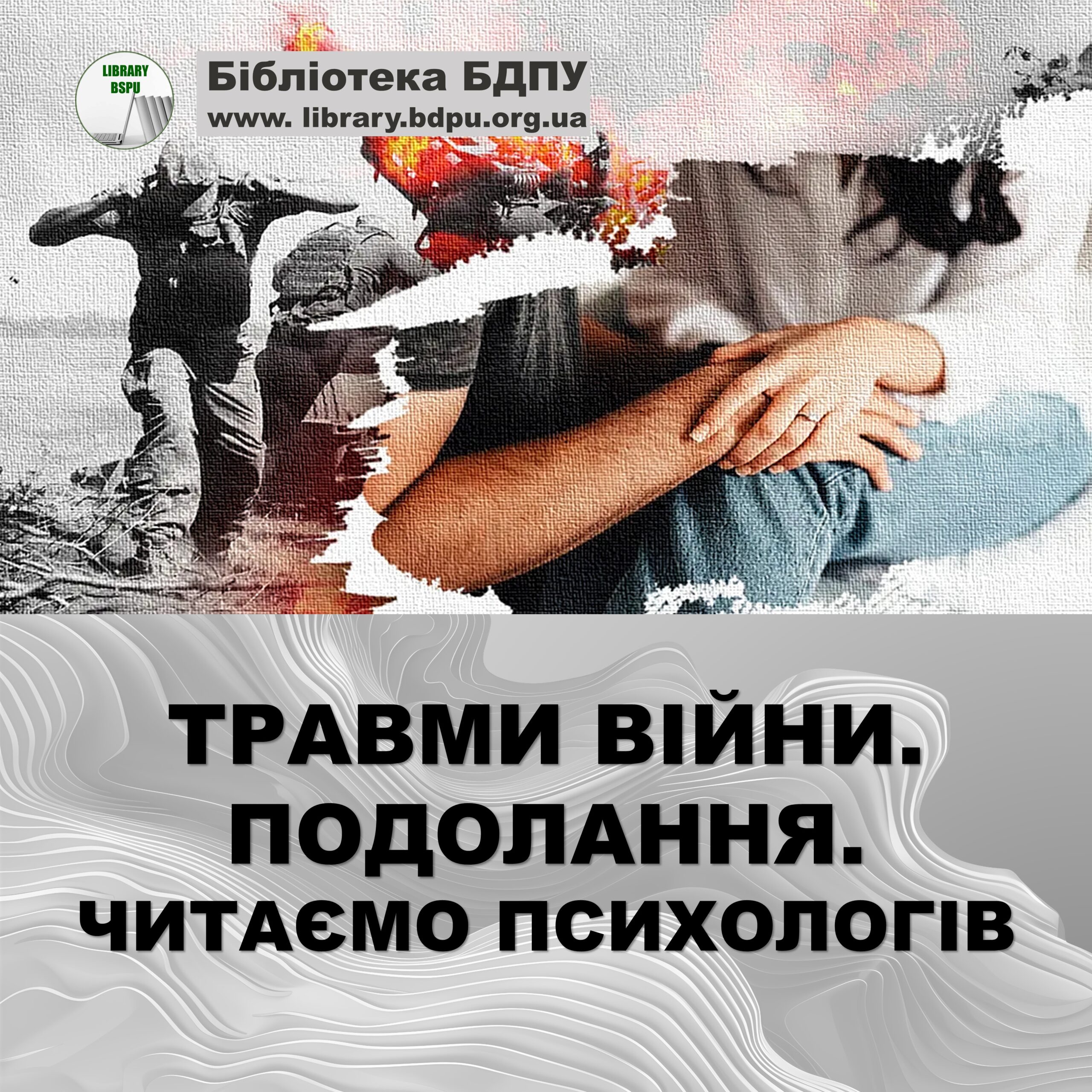 Травми війни. Подолання. Читаємо психологів Ми травмовані війною. Хтось більшою мірою, хтось — меншою, і не лише фізично. І всім нам треба відновитись, зберегтись, не втратити себе чи просто вибратися з тої безодні болю, відчаю, втоми, яка дивиться на нас та періодично намагається затягти до себе. Ми маємо вчитись зберігати свій психофізичний стан в нормі (наскільки це можливо і дозволяють обставини). Бібліотека презентує віртуальну виставку «Травма війни. Подолання. Читаємо психологів». Дивитись: Травми війни. Подолання. Читаємо психологів, Зберегтись. Бути. Перемогти. Психолог і війна, Казкотерапія виховує, лікує, розвиває, Психологія кризових станів: тривожні виклики доби 24.02.2025 |