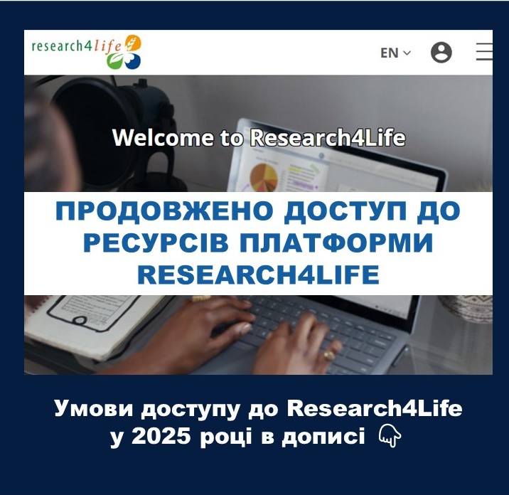 Продовжено доступ до Research4Life у 2025 році Українські наукові установи та заклади вищої освіти матимуть безкоштовний доступ до ресурсів Research4Life у 2025 році. Це рішення враховує безпекові виклики та статус України (група А). Доступ також надається українським науковцям за кордоном, якщо вони офіційно працюють у своїй установі. Дякуємо Research4Life за підтримку української науки! Дивитись «Умови доступа до Research4Life» 30.12.2025 |