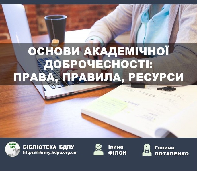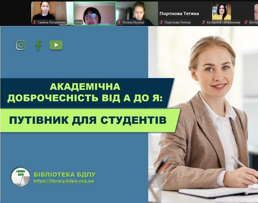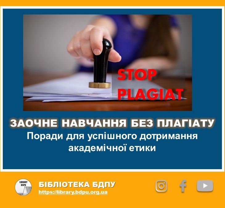 Бібліотека БДПУ провела захід з академічної доброчесності для студентів магістратури спеціальності 012 Дошкільна освіта (заочна форма). Учасники дізналися про принципи академічної етики, правильне цитування та користування електронними ресурсами, що допоможуть у навчанні та написанні наукових робіт. Особливу увагу приділили питанням самоорганізації в умовах дистанційного навчання.