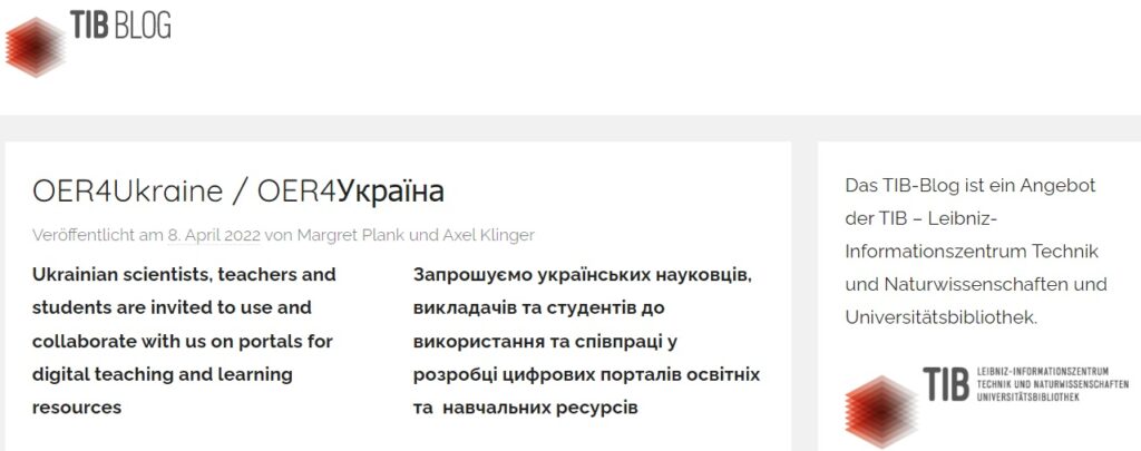 Національна науково-технічна бібліотека Німеччини пропонує цифрові освітні ресурси та аудіовізуальні матеріали з різних галузей знань, таких як : інформатика, математика, фізика, та ін., які доступні на її сайті багатьома мовами, зокрема, українськоюю. Open Educational Resources Search Index – пошуковий індекс відкритих освітніх ресурсів, який містить понад 43 тис. відкритих освітніх матеріалів; TIB AV-Portal – портал для розміщення наукових відео, на якому доступні понад 38,5 тис. освітніх та наукових відеоматеріалів. Посилання:http://bit.ly/3N2mQTU