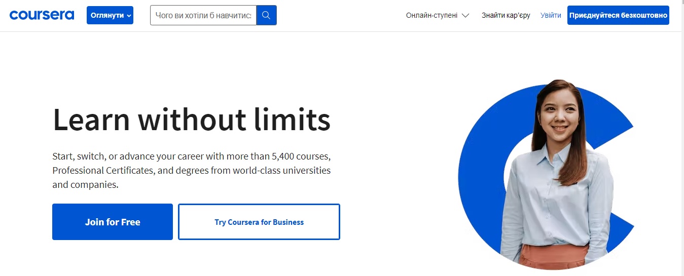 Coursera пропонує безкоштовні онлайн-курси для українських студентів. Кожен студент України може отримати безкоштовний доступ до курсів «Coursera – платформи онлайн-навчання, заснованої викладачами Стенфордського університету . Серед партнерів платформи – Stanford, Penn, Google, IBM, Johns Hopkins University, Meta та сотні інших Для студентів України відкрито понад 6, 5 тисяч курсів з 400 спеціалізацій за програмами найкращих університетів та компаній світу. Посилання: https://ru.coursera.org/