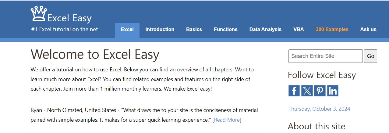 Excel Easy пропонує навчальний посібник із використання Excel. Нижче ви можете знайти огляд усіх розділів. Хочете дізнатися більше про Excel? Ви можете знайти пов’язані приклади та функції в правій частині кожного розділу. Приєднуйтеся до понад 1 мільйона учнів щомісяця. Посилання: https://www.excel-easy.com/