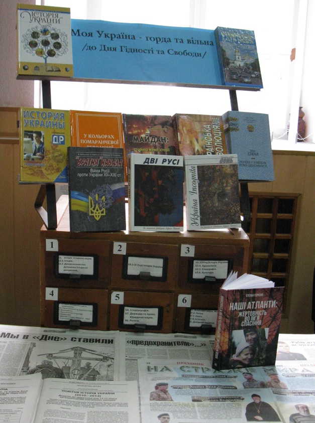 Бібліотека БДПУ підготувала виставку «Моя Україна – горда та вільна» (каб. № 143). На виставці представлені книги, публікації в періодичних виданнях. Цікавий аспект виставки – краєзнавчі матеріали про учасників Майдану, волонтерів та воїнів-захисників – наших земляків.