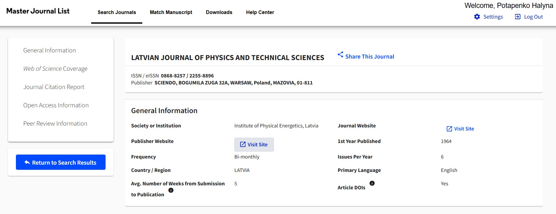 Для перевірки чи оригінальним є сайт журналу, та чи задекларований він на сайті Web of Science, необхідно перейти за посиланням Journal Website, для цього натисніть кнопку «Visit Site» система автоматично перейде на сторінку журналу, в нашому випадку це журнал «Latvian Journal of Physics and Technical Sciences».