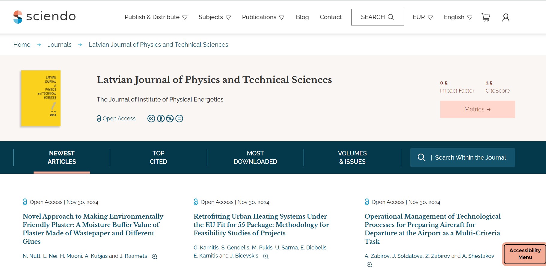 Для прикладу, перевіримо журнал «Latvian Journal of Physics and Technical Sciences» (видавництво SCIENDO, країна Латвія). Його офіційний сайт: https://sciendo.com/journal/LPTS